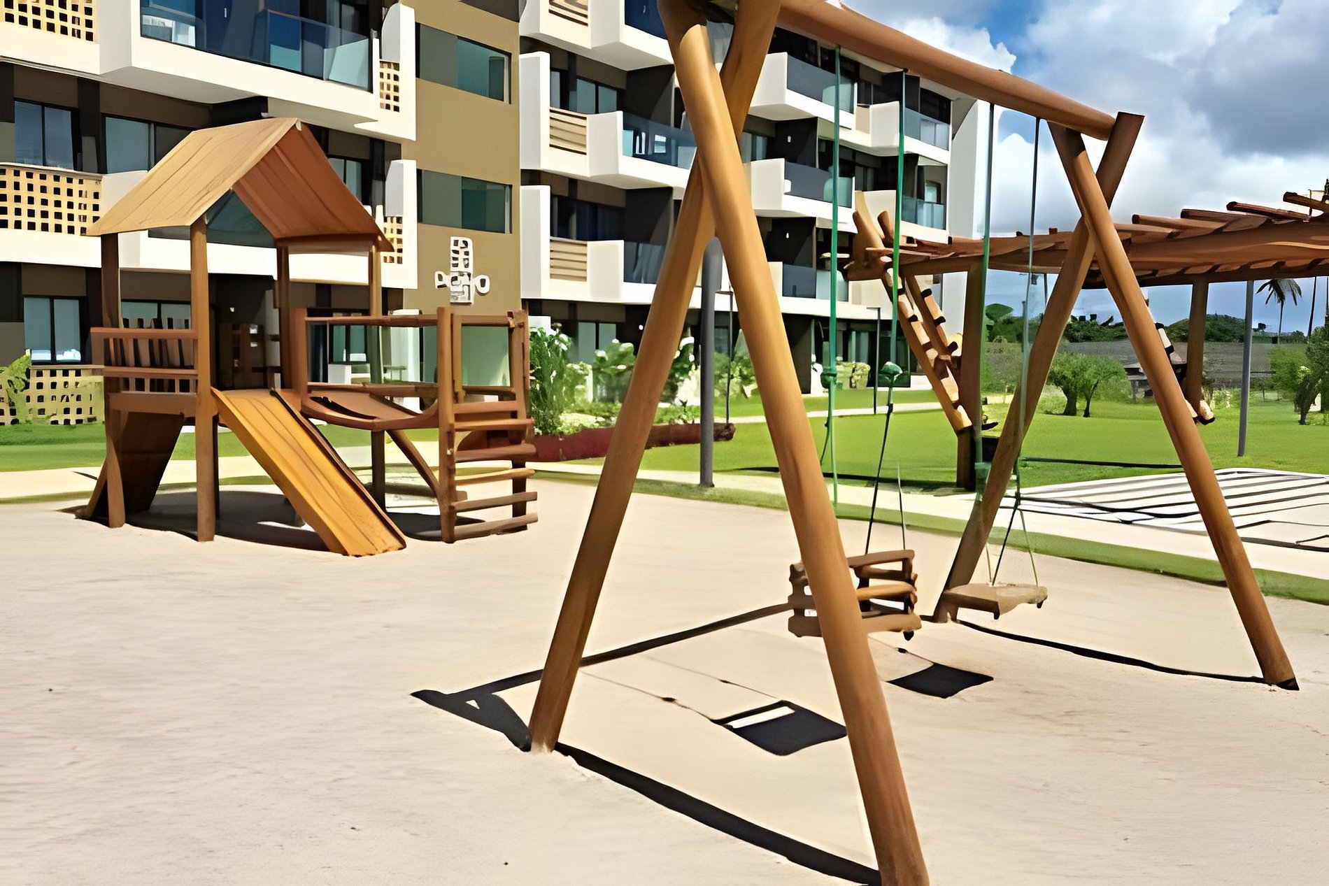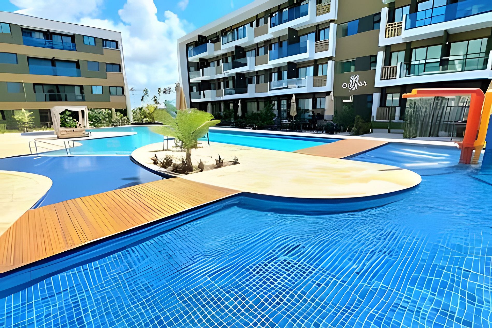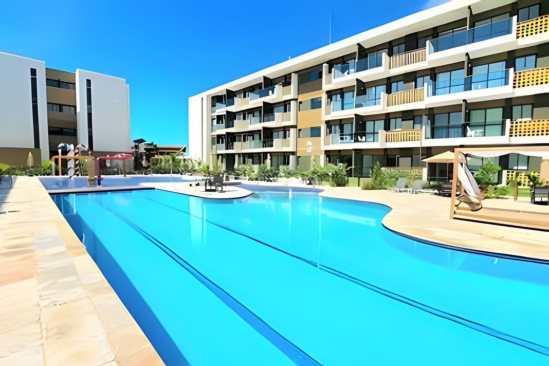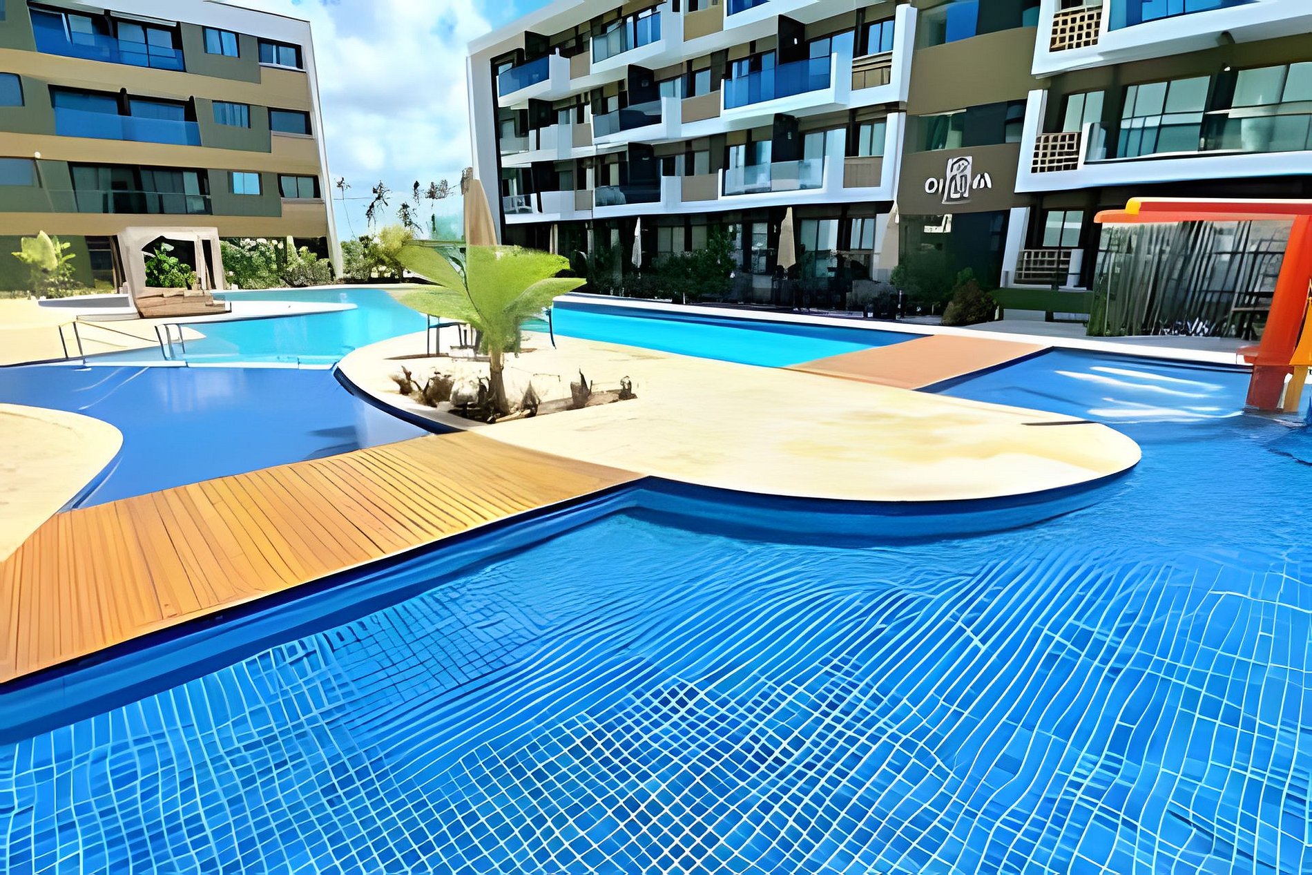 Este é um condomínio Resort, com varias piscinas, piscina com raia para um nado mais longo, piscina rasa e mais funda para lazer, piscina com brinquedos com parques aquáticos, campo de futebol, academia, ping-pong, sinuca, brinquedoteca, restaurante, conveniência entre outras coisas. Temos duas unidades extamente iguais, tipologia decoração, e roupa de cama mesa e banho