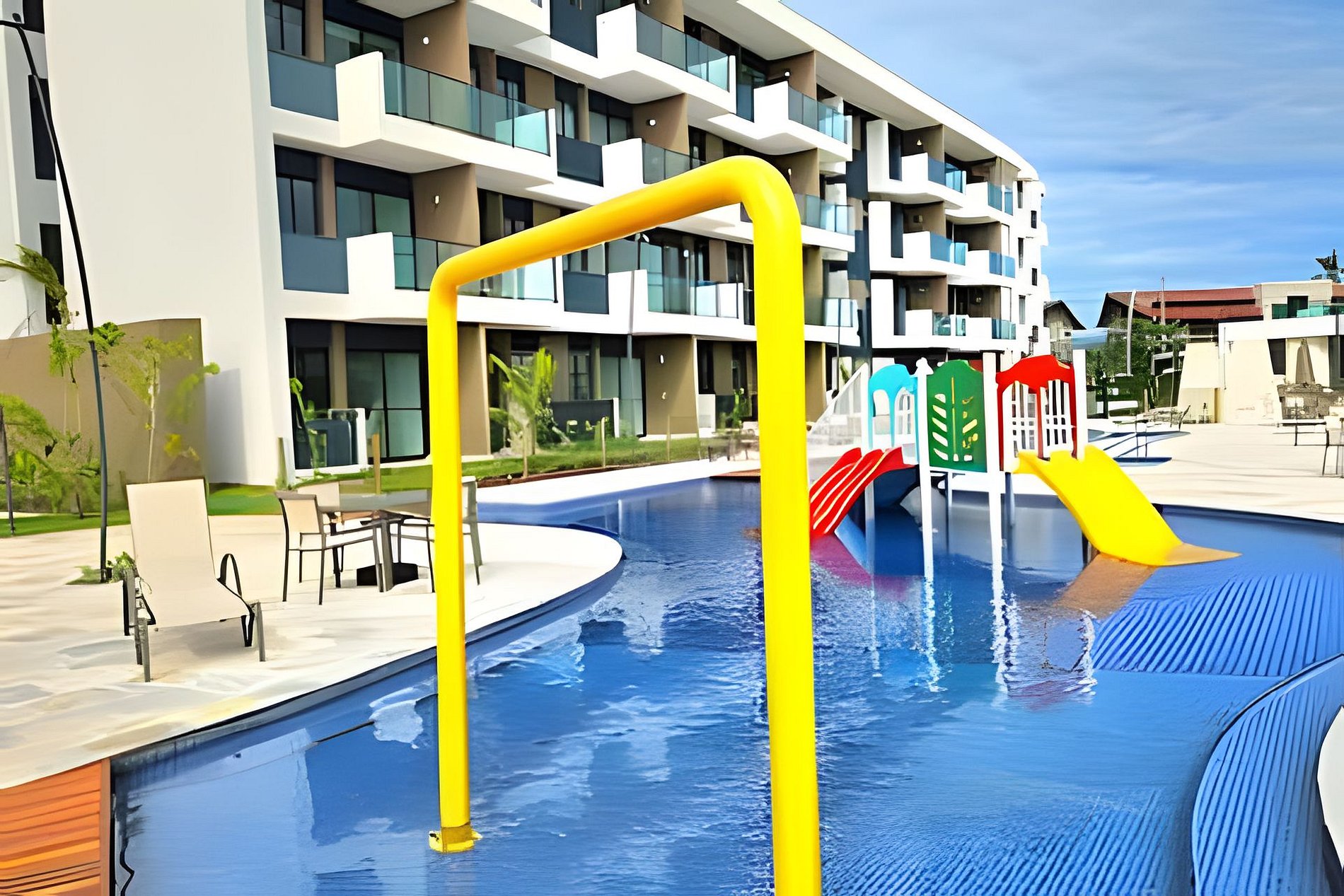 Este um condomínio Resort, com varias piscinas, piscina mais funda para um nado mais longo, piscina rasa e temática para lazer, piscina com brinquedos com parques aquáticos, campo de futebol, academia, ping-pong, sinuca, brinquedoteca, restaurante, conveniência entre outras coisas. Temos duas unidades exatamente iguais, tipologia decoração, e roupa de cama mesa e banho.