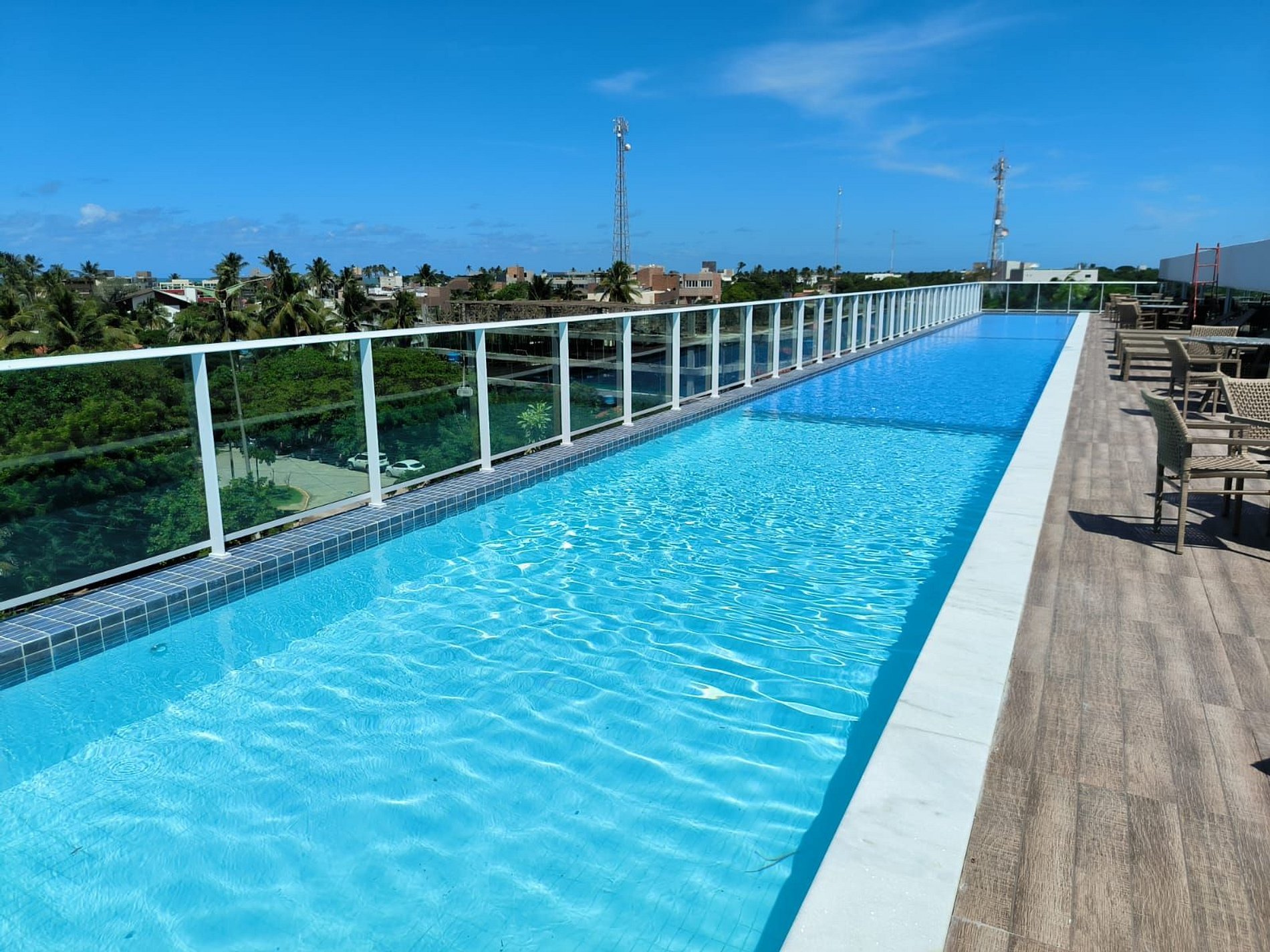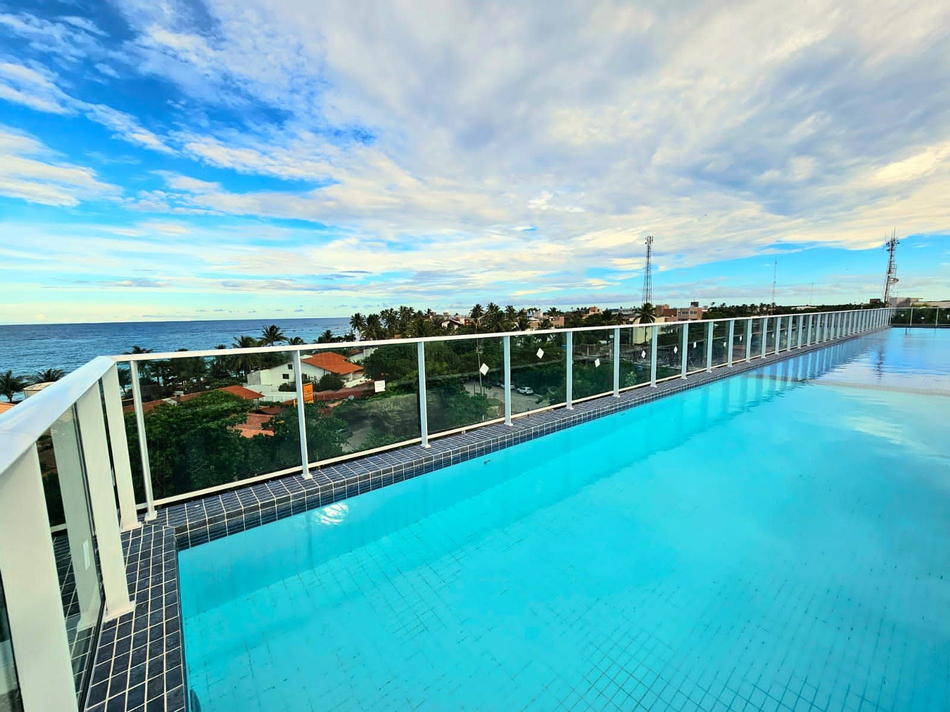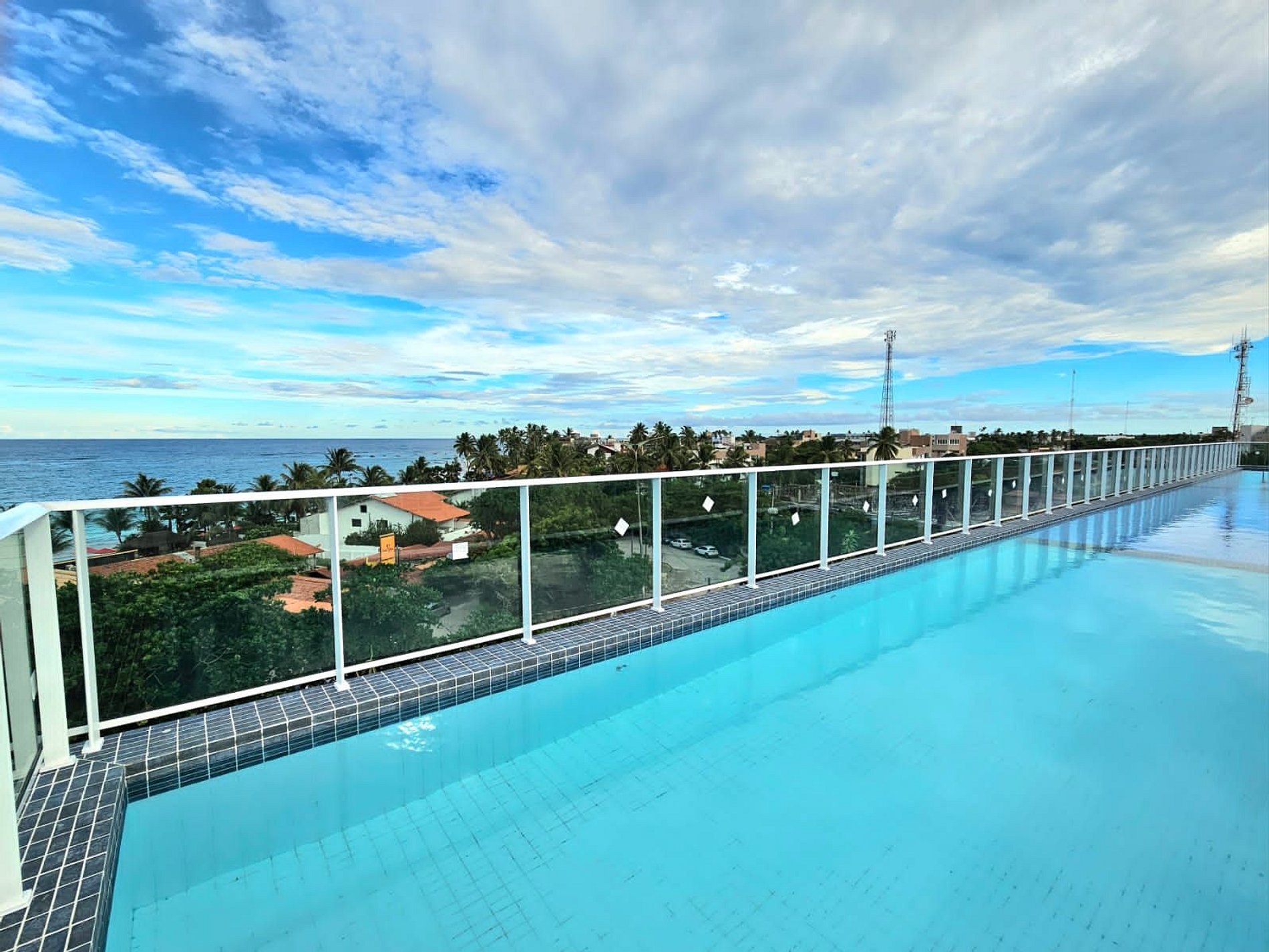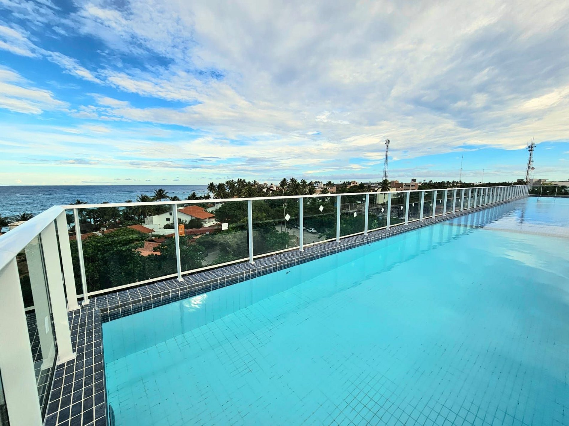 O prédio tem rooftop (cobertura) com a maior piscina de borda infinita de Porto de Galinhas, com vista para as tão famosas piscinas naturais e jangadas.
