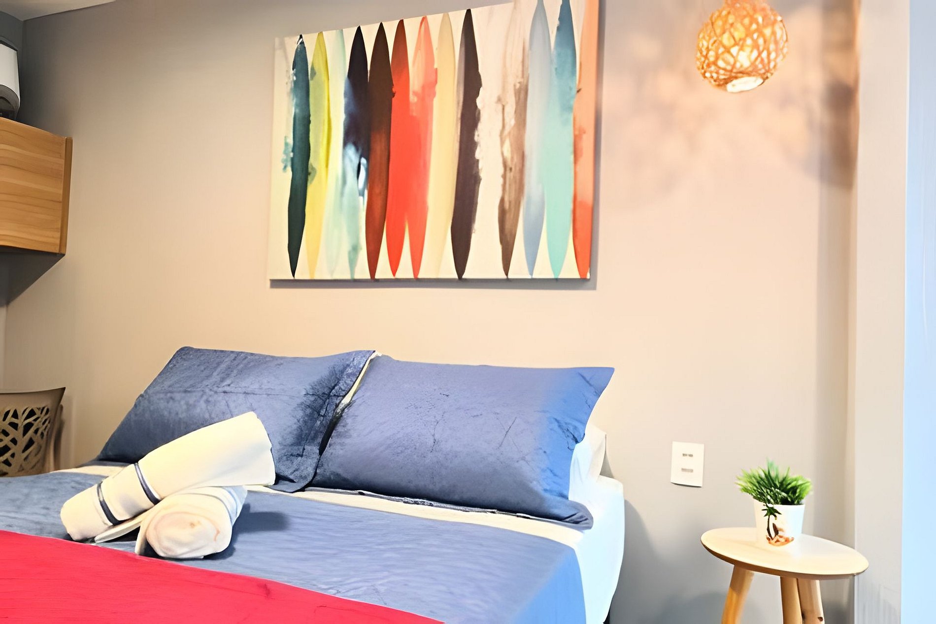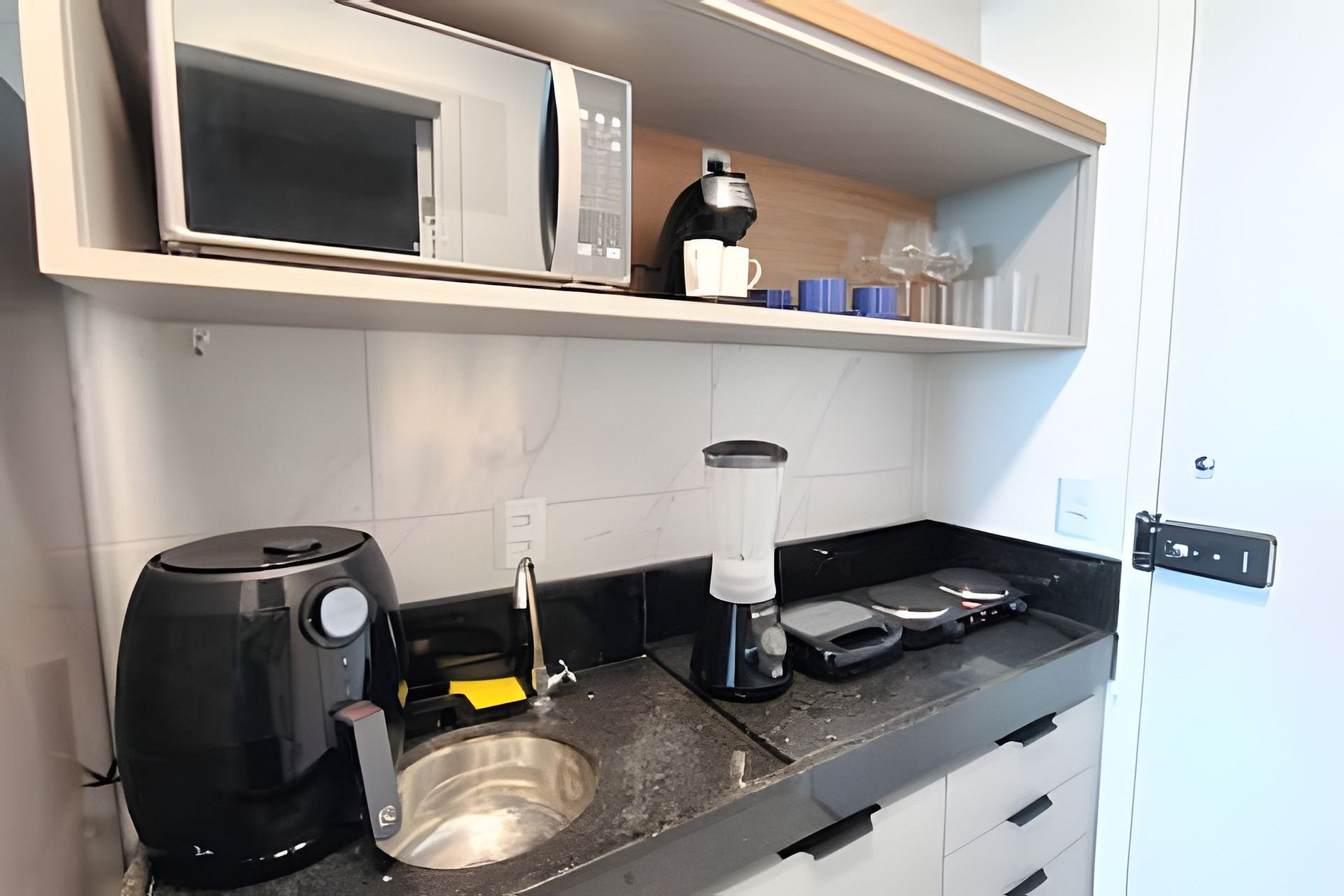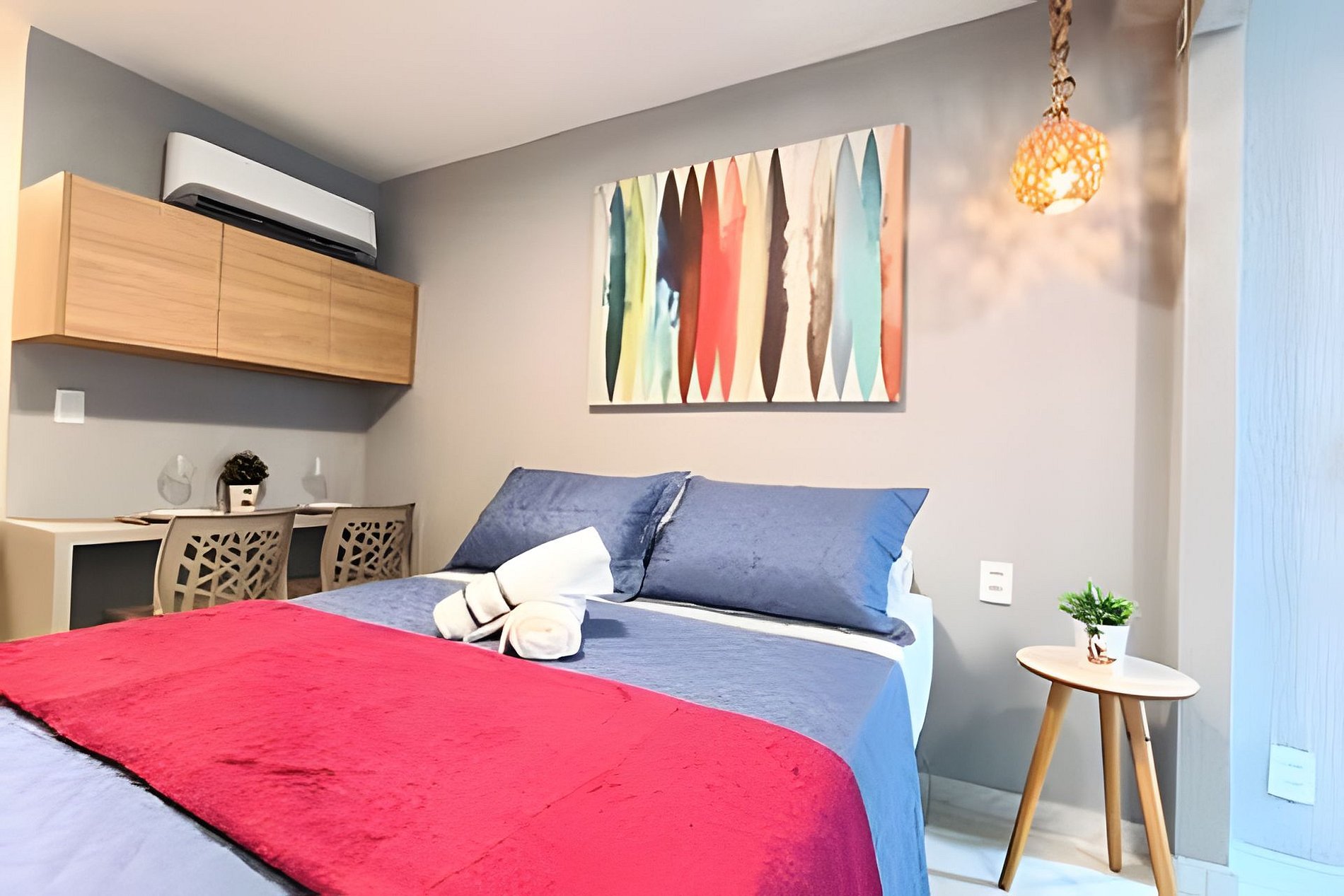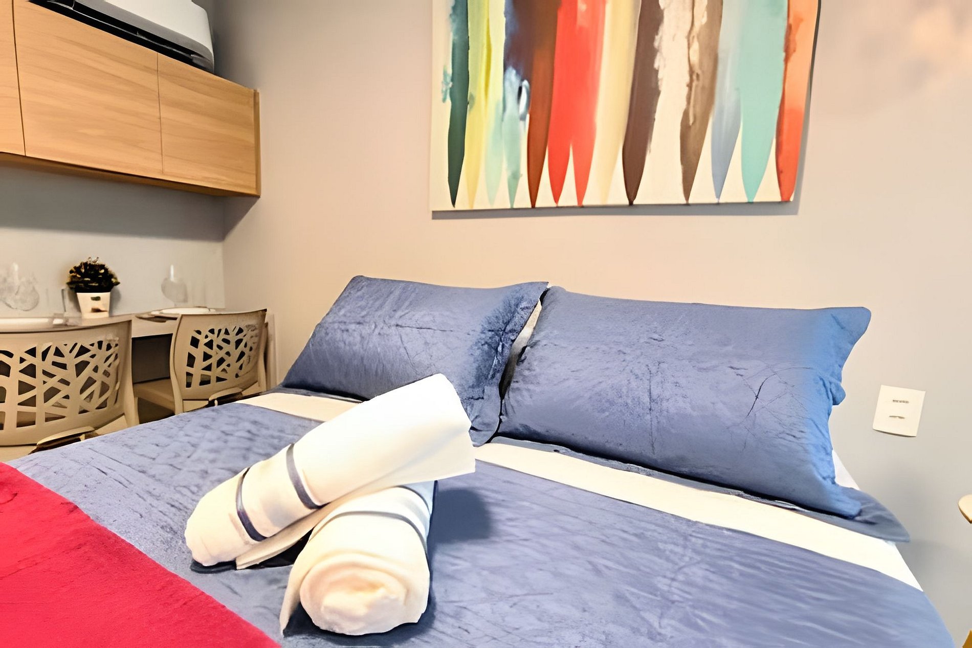 O espaço é formidável para o casal ou no máximo 4 pessoas (1 cama casal, 1 cama auxiliar solteiro e 1 puff dobrável/colchão). Apartamento completo e confortável, muito bem decorado e com toda comodidade. Os melhores eletrodomésticos, incluindo sanduicheira, liquidificador, air fryer, entre outros. Tudo novo esperando por você.