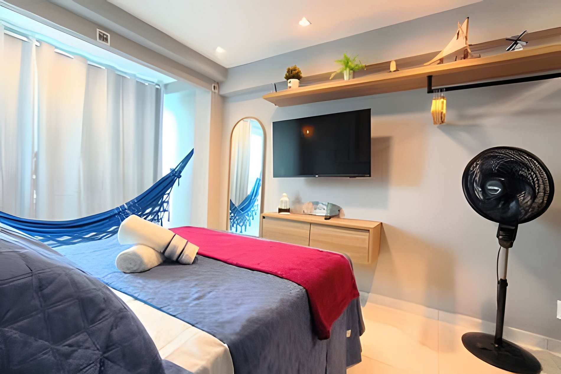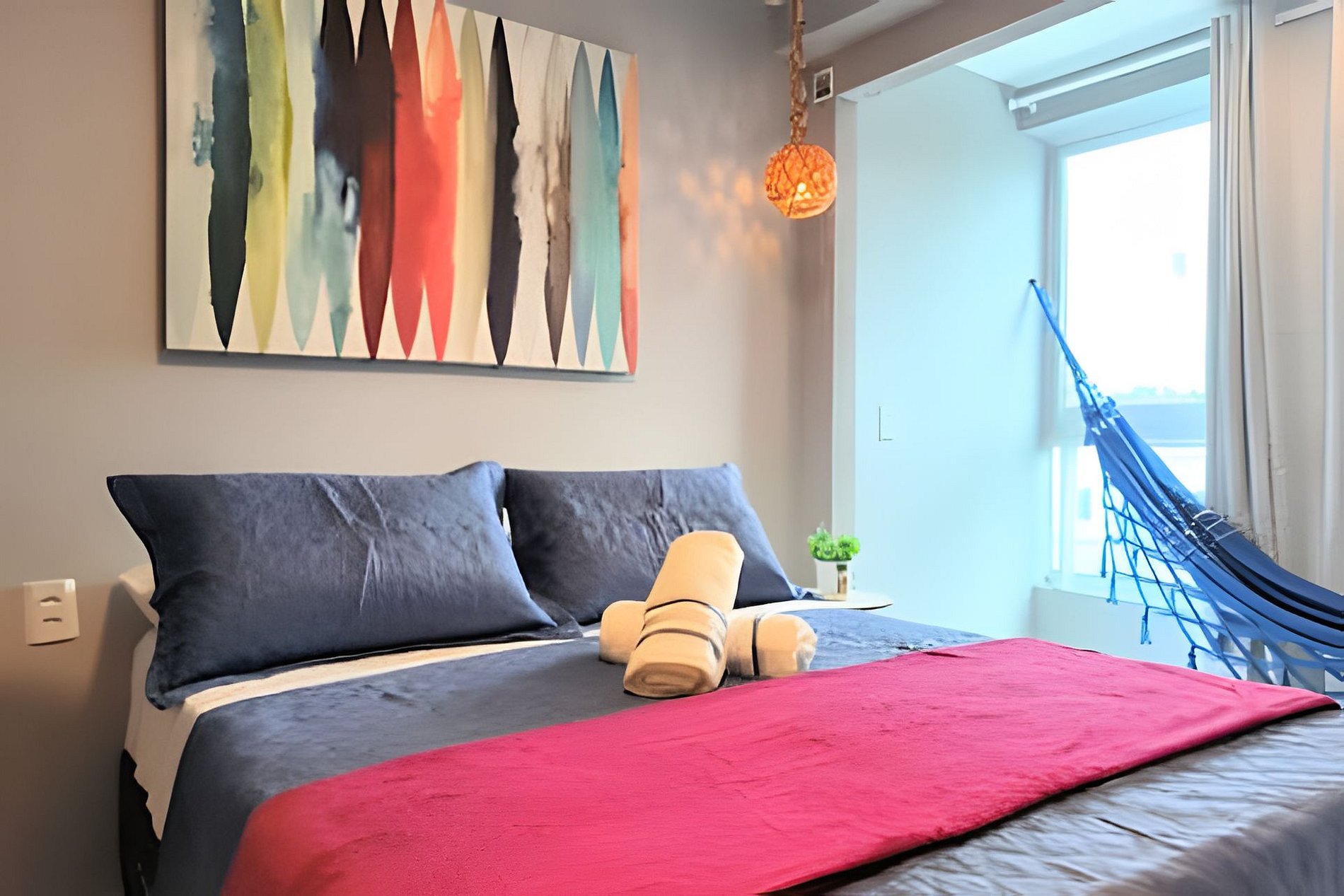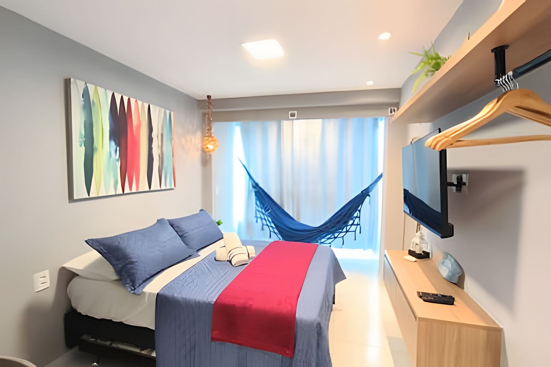 O espaço é formidável para o casal ou no máximo 4 pessoas (1 cama casal, 1 cama auxiliar solteiro e 1 puff dobrável/colchão). Apartamento completo e confortável, muito bem decorado e com toda comodidade. Os melhores eletrodomésticos, incluindo sanduicheira, liquidificador, air fryer, entre outros. Tudo novo esperando por você.